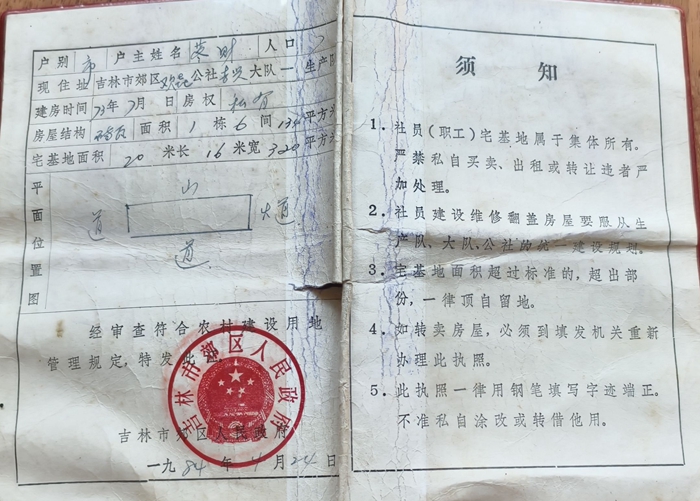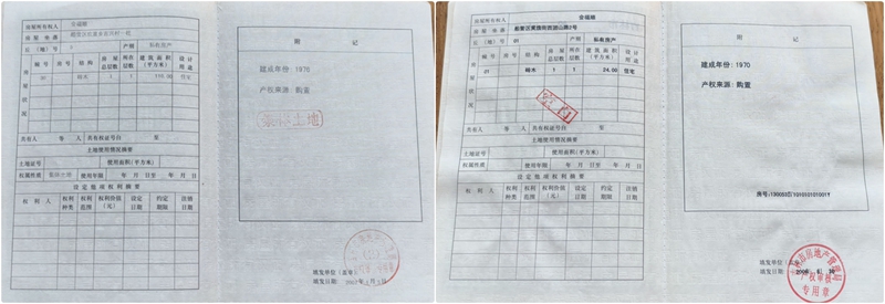 我们家在此处的两套房屋均不属于他们强拆范围,均有合法房产证:一套,吉林市房权证乡镇字第J14-041475号,建筑面积110㎡,建成年份是1976年,产权来源为购置,集体土地;另一套吉林市房权证船字第S110055983号,建筑面积24㎡,建成年份为1970年,产权来源为购置,国有土地。两处房产都有政府发给的产权证书(见附图)。宅基地证书面积320平方米,宅基地证书颁发年份是1984年。