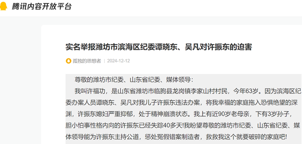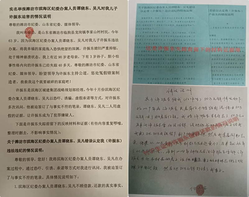 我叫许福功,是山东省潍坊市临朐县龙岗镇李家山村村民,今年63岁。因为滨海区纪委办案人员谭晓东、吴凡对我儿子许振东违法办案,将我幸福的家庭拖入恐惧绝望的深渊,许振东媳妇严重抑郁,处于精神崩溃状态。我上有近90岁老母亲,下有3岁孙子,胆小怕事性格内向的许振东已经失踪40多天!我盼望尊敬的潍坊市纪委、山东省纪委、媒体领导能为许振东主持公道,惩处冤假错案制造者,救救我这个就要破碎的家庭吧!
