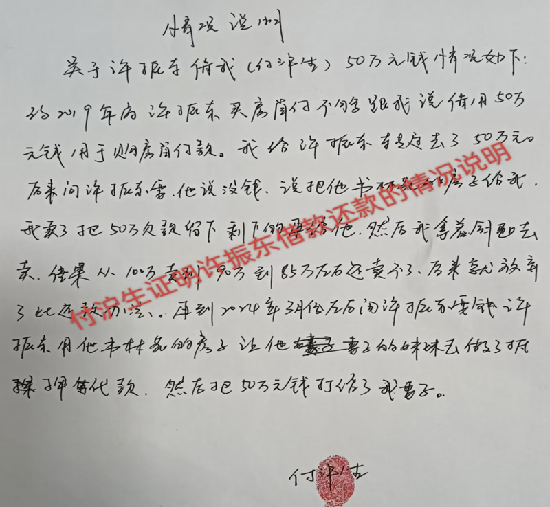 今年年初,付沪生又跟我要钱,我说房子也卖不动,要不注册个公司用我的房子做抵押贷款吧。于是,我就让我妻子的妹妹作法人及大股东,成立了辰星公司,授信了抵押贷款58万元。5月份贷款下来,辰星公司一次性转给付沪生个人账户50万元。后来,我要用钱,付沪生又转给了我20万元,这样我借付沪生的50万元已归还付沪生30万元,还有20万元没还。