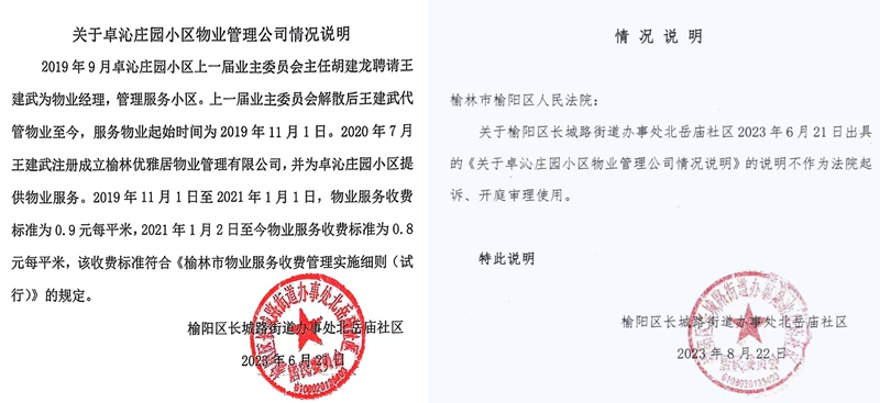 多次催收无果后,迫于无奈,我公司只能通过法律途径维护自己的合法权益。诉讼期间,北岳庙社区于2023年6月21日向法院出具《关于卓沁庄园小区物业管理公司的情况说明》,明确载明:“榆林优雅居物业管理有限公司自2020年7月起实际服务管理卓沁庄园小区。”然而,2023年8月22日,社区突然另行出具一份《说明》,声称此前文件“不作为起诉、开庭审理使用”。该行为直接导致法院难以认定事实,部分业主借此拒缴费用,恶意拖欠行为进一步蔓延。在我公司向法院诉请业主支付物业费的案件中,业主不认可我们的物业服务,拒绝向我公司缴纳物业费,法院亦认为我们之间不存在物业服务关系,业主据此不缴纳物业费(详见附件(2023)陕0802民初8020号、(2024)陕08民终660号判决书)。在业主诉请物业公司因不清扫楼门口积雪致使业主滑倒受伤请求承担违反安全保证义务的赔偿金时,法院又认定我公司和业主之间存在物业服务关系,判决我公司支付医疗费(详见(2024)陕0802民初5657号民事判决书及(2024)陕08民终5476号民事判决书)。正是由于社区负责人滥用权力出具自相矛盾的证明文件,导致法院对事实无法认定,严重干扰司法程序,涉嫌包庇违法欠费行为,我公司为了为小区提供物业服务,聘请第三方对电梯进行维保、聘请保洁、保安对小区进行维护,自己垫付大量金钱,但现在面临大量业主因社区不作为、乱作为拒不缴纳物业费,一方面不认可我们的物业服务,一方面又让我公司承担赔偿责任,对此,社区自始至终无视我公司的现状,反而助长部分业主不缴纳物业费的气焰,其行为对我公司的维权造成了极大的阻力,致使我公司的合法权益受损,其滥用职权的行为应当被查处,并依法严惩。