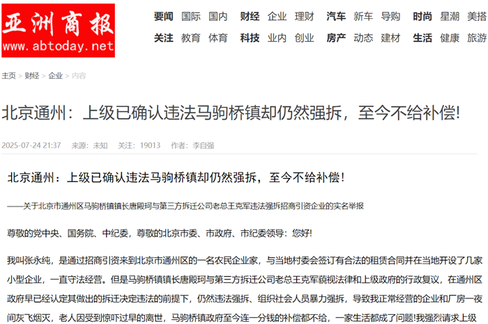 我叫张永纯,是通过招商引资来到北京市通州区的一名农民企业家,与当地村委会签订有合法的租赁合同并在当地开设了几家小型企业,一直守法经营。但是马驹桥镇镇长唐殿珂与第三方拆迁公司老总王克军藐视法律和上级政府的行政复议,在通州区政府早已经认定其做出的拆迁决定违法的前提下,仍然违法强拆、组织社会人员暴力强拆,导致我正常经营的企业和厂房一夜间灰飞烟灭,老人因受到惊吓过早的离世,马驹桥镇政府至今连一分钱的补偿都不给,一家生活都成了问题!我强烈请求上级党政机关和纪检部门认真调查此事,严肃查出案涉人员,还我们一家人一个公道,还人间一个公平正义!