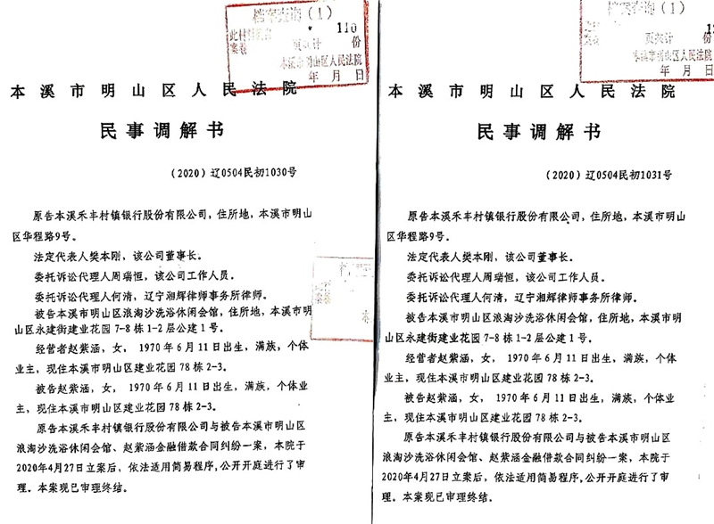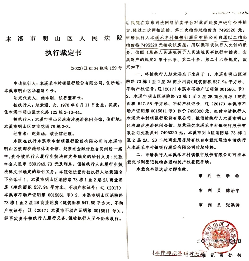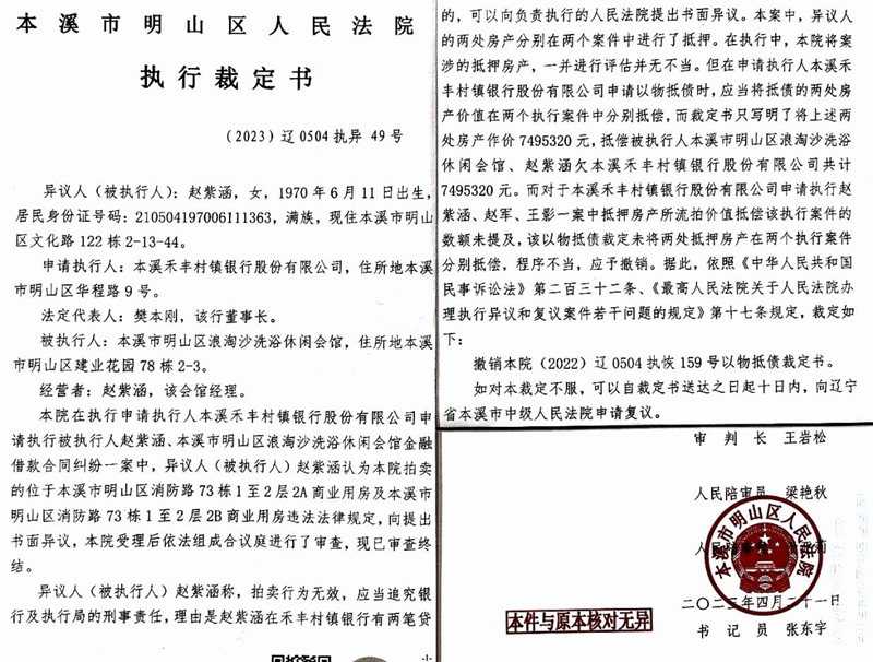 2022年11月19日,赵紫涵接到明山区法院的执行裁定书,马上联系明山法院执行局的法官曲靖武(法院的法警),询问是什么情况,为什么拍卖两次都不通知赵紫涵及其代理人并且流拍了还以物抵债呢?更恶劣的是两处房产、两个抵押分别是600万和498万,而明山法院执行局却让本溪禾丰村镇银行以749.532万元的价格将两处房产以物抵债,却只清了一笔498万的贷款,那笔600万的贷款没清而抵押房产却不翼而飞了,这是银行、法院、律师、拍卖公司弄虚作假、违纪、违法的典型案例。