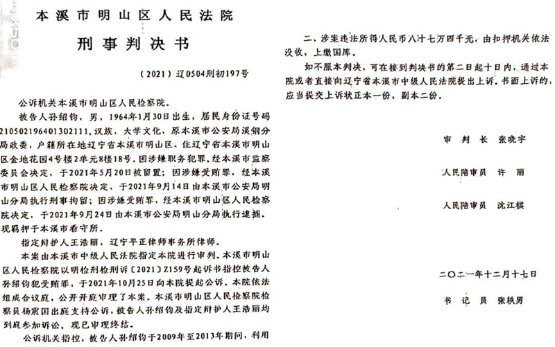 2021年5月13日,赵紫涵向本溪市纪委实名举报孙绍钧贪污、受贿、重婚、诈骗、充当保护伞,并提交了充足的犯罪证据。2021年9月,本溪市纪委监委只针对孙绍钧受贿罪向本溪市明山区检察院移交,其他罪名忽略不计,也没有任何解释。根据《中华人民共和国刑法》第三百八十三条规定,受贿87.4万元应属“数罹薮�”,判处三年以上十年以下有期徒刑,但是2021年12月17日明山区法院只判了孙绍钧三年有期徒刑,取最低线,属重罪轻判!