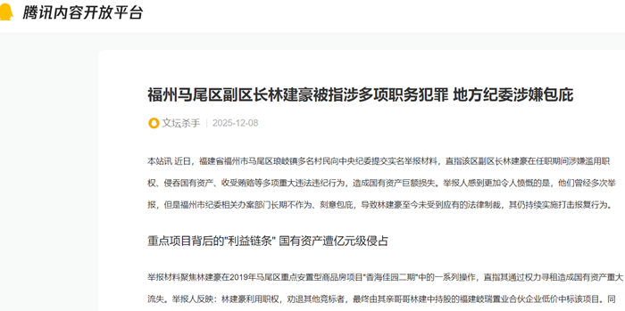 举报材料聚焦林建豪在2019年马尾区重点安置型商品房项目"香海佳园二期"中的一系列操作,直指其通过权力寻租造成国有资产重大流失。举报人反映:林建豪利用职权,劝退其他竞标者,最终由其亲哥哥林建中持股的福建岐瑞置业合伙企业低价中标该项目。同时,他还安排自己持股的福建省晋一建设发展公司承建工程,从中获取数十万元非法利益。