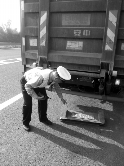 27日上午,一辆琼A号牌的货车在海屯高速入口处被拦下。据货车司机介绍,车上拉着一整车的氧气罐。交警检查发现,该货车未悬挂后车牌,货车司机从驾驶室拿出后车牌称,因车牌悬挂部件损坏才未悬挂。交警还发现此货车尾部未粘贴明显的反光标志。据交警介绍,很多司机上高速公路未悬挂后车牌,是为了躲避超速行驶等违法行为的查处。按照规定,该货车将被处以罚款100元,扣12分并扣车的处罚。