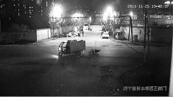 25日晚,济宁市区新元路丰泰园小区南门处发生一起交通事故,一辆摩托车撞上一辆电动三轮车,摩托车车主受伤倒地不起。三轮车车主只回头看了一眼后,驾车逃逸。济宁高新区交警部门根据事发时的监控录像,锁定肇事车辆为一辆环卫垃圾车。