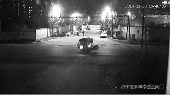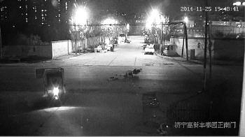 由于事发现场有两处监控探头,民警调取了事发时段的监控。监控显示,25日19时48分26秒,一辆电动三轮车正要横穿马路,19时48分35秒时,一辆摩托车高速自西向东行驶,径直撞上三轮车中部,剧烈的撞击将三轮车向东偏离了2米多。发生事故后,三轮车车主没有下车,只是回头看了看,然后径直开进了丰泰园小区。通过画面分析,民警确定三轮车为环卫垃圾车。