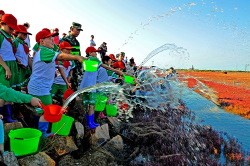 7月17日下午,充满爱的一幕在辽宁盘锦黑嘴鸥觅食地上演:海水涨潮,环保志愿者们手拎水桶,将一舀舀“水”洒向滩涂。这一舀舀“水”中,满是人工孵化的沙蚕苗,是黑嘴鸥的精品食物。这是“黑嘴鸥觅食地生态恢复项目”的一个重要部分。