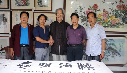 本站讯 在纪念抗日战争胜利70周年前夕,笔者有幸走访了被称为“牡丹之父”的我国著名杰出画家邵仲杰老师,更为有幸的是随邵老参加了由成都市文联、成都市龙泉驿区委宣传部、成都市新都区委宣传部、成都市新都区文广新局等单位联合举办的“中国梦、桃红龙泉驿、桂香溢新都”大型美术展。其画展以“中国梦”为主旋律,彰显信仰之美,崇高之美,充分挖掘了当地本土历史文化、风土人情和自然风光,有深度、接地气、抒发出人民群众对袓国和家乡的热爱之情。随邵老参加了开幕式又观看画展,又和他一起在四川国防书画院、成都锦水书画院、邵仲节牡丹艺术研究院里,两天的访谈中和观看他创作中,已91高龄的他清晰的思路,祟高的境界,神采奕奕的精神,给我留下难以忘怀的印象,他祟高的思想境界和对艺术传播美好、传播正能量的认识令我十分佩服、十分敬仰这位慈祥的老人。