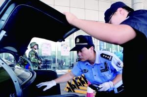 北京晨报记者在检查站看到,两名全副武装的武警一人持枪一人持弹,背靠背站在检查站通道旁边不断巡逻,身旁还配备了防暴盾、防弹盾以及移动式阻车路障。