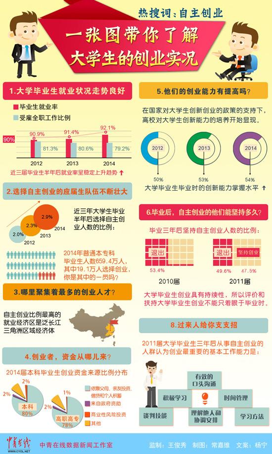 麦可思研究院研究了近年的数据后发现,包括本科毕业生和高职专院校毕业生在内的中国大学生毕业后选择自主创业的比例基本呈逐年上升的趋势:2007年1.2%,2008年1%,2009年1.2%,2010年1.5%,2011年1.6%,2012年2%,2013年2.3%,2014年2.9%。