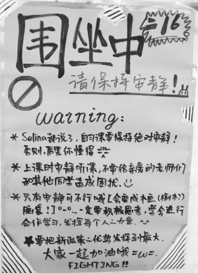 我们走进高二(16)班的教室,有两名女生正坐在金色日光中安静地自习。当同行对她们举起相机,她们先是不约而同双手挡住了脸,接着蹲下去躲在了书桌的后面。阳光掠过她们的头顶,打在了墙上贴着的一张自制海报上,上面写着:“围坐中,请保持安静!”