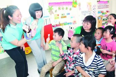 北京市丰台实验幼儿园的老师跟小朋友们玩手偶游戏。记者 樊世刚 摄