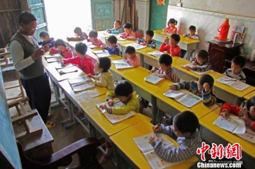 资料图:湖南道县蚣坝镇下福洞村村小一名乡村教师,21名小学一年级学生,组成了一所“袖珍”客厅学校。何红福 摄