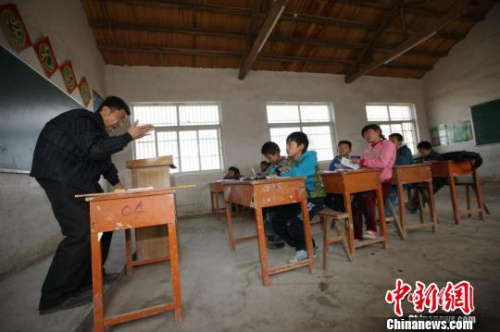 资料图:2014年4月2日,蒙城县篱笆镇姜刘小学三年级教室,朱景科老师用手支撑着身体给学生讲课。