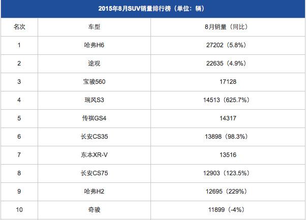 2015年8月SUV销量排行榜前10位 (数据来源:乘联会)