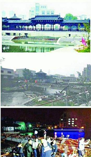 上图:垮塌前的廊桥。下图:廊桥垮塌后正在抢险。