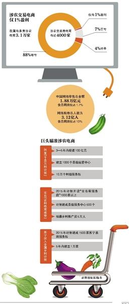 谱润投资合伙人金重仁告诉新京报记者,过去十几年,图书、服装、3C领域,都已经实现了高度的电商化,但涉农领域的电商化程度依然很低。据农业部统计数据显示,2014年全国农产品网络交易额超过1000亿元,占农产品销售额的3%,低于零售品电商网购占比7.9%的平均水平。