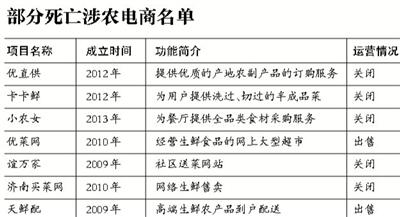 在激烈竞争下,一些农产品电商已经倒闭。据记者不完全统计,近期倒闭的有小农女、优菜网、谊万家等,也有自动下线的永辉“半边天”。在资本市场趋冷背景下,越来越多的玩家出局,俺有田创始人徐晓峰告诉新京报记者,据他观察,仅在上海,今年就有十几家涉农电商死掉。优值供半月前贴出紧急通知,称因业务调整将于8月31日关闭,目前页面所有的产品都已经下架。