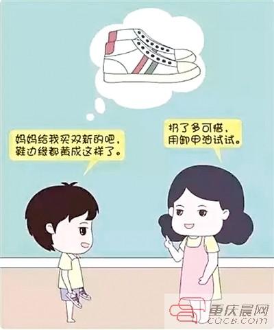 妈妈给我买双新的吧,鞋边都黄了。 扔了多可惜,用卸甲油试试。