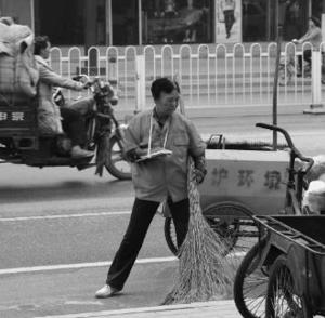 ■手臂骨折仍坚持清扫的环卫工,感动众多网友。