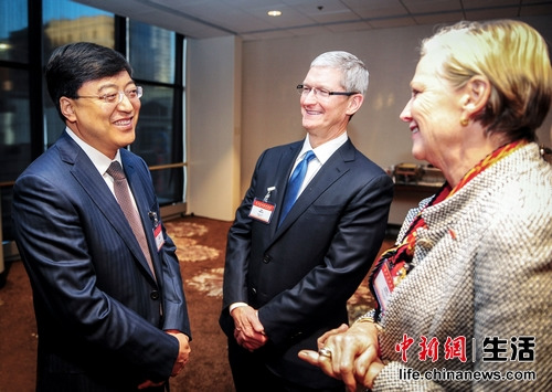 伊利集团董事长潘刚(左一)和苹果公司首席执行官库克、杜邦公司董事长柯艾伦热烈交谈