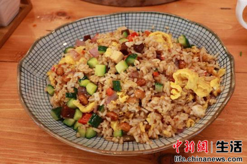 3.用大葱和洋葱炝锅,放入米饭、豆腐干、黄瓜、笋豆、鸡蛋、红椒、盐、鸡精翻炒均匀;