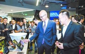 微软CEO纳德拉上任以来多次示好中国市场,图为纳德拉去年9月来华参观微软亚洲研究院