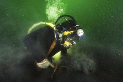 考古队员对致远舰进行水下调查。