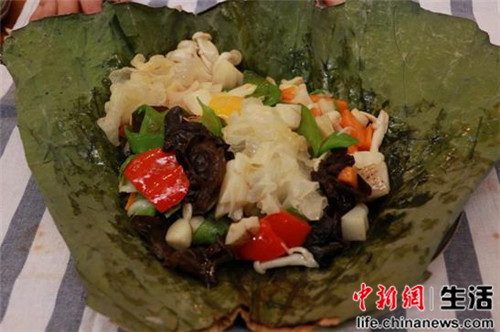 材料:藕荷 兰豆 蘑菇 百合 木耳 银耳 荸荠 鲜荷叶 胡萝卜 黄椒 红椒 盐 芝麻油