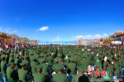 帕巴拉·格列朗杰、热地、自治区党委书记陈全国、自治区主席洛桑江村等领导及几千名国内外嘉宾参加开幕式 中新社发 王保胜 摄