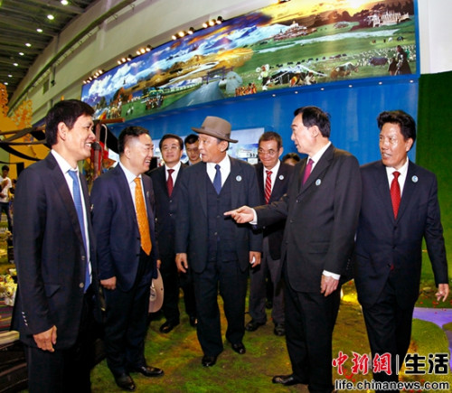 十届全国人大常委会副委员长热地,西藏自治区党委书记陈全国,自治区主席洛桑江村,与参加博览会的嘉宾华泰汽车集团董事长张秀根、中国重彩油画奠基人周昌新亲切交流 中新社发 王保胜 摄