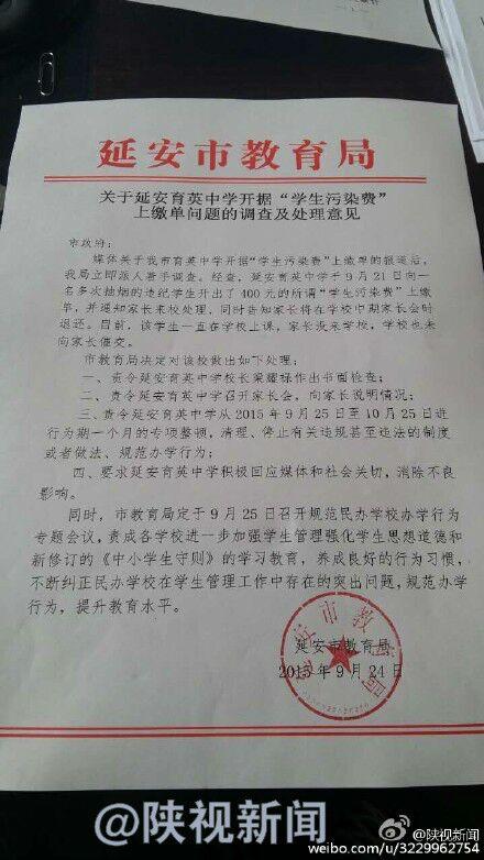 关于此事,延安市教育局表示,学校罚款即使之后退还也属于违规乱收费,坚决不允许。经过他们调查,被曝出照片的罚单,学生家长目前还没有缴纳。但教育局决定对育英中学做出以下处理: 一、责令延安育英中学校长作出书面检查;二、责令延安育英中学召开家长会,向家长说明情况;三、责令延安育英中学从2015年9月25日至10月25日进行为期一个月的专项整顿,清理、停止有关违规甚至违法的制度或者做法、规范办学行为。(陕西广播电视台《第一新闻》黄挺 崔龙)