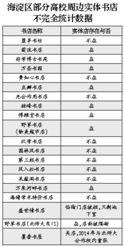 2010年前后,某大学生网友曾整理过一份图文并茂的北京高校“书店版图”,当时作者曾按照书店的集群性分布,把海淀区的高校书店分为了四个商圈,分别是北大及万泉河,清华及蓝旗营,海淀图书城及海淀黄庄,北师大及其他周边,上面列出了40余家大大小小的校园书店。北青报记者按图索骥,走访北大、北师大、清华的校园周边。据不完全统计,近5年时间里,这些区域内的20家高校书店,竟有十家已从版图上黯然“消失”。“消失”的,既有规模显赫、名声在外的,如“第三极书店”、“风入松”者,也有北大畅春园附近小平房内暗藏的六七家人文小书店。还有书迷还告诉北青报记者,甚至连北大周末书市也“因校园用地紧张”于去年春天戛然而止。