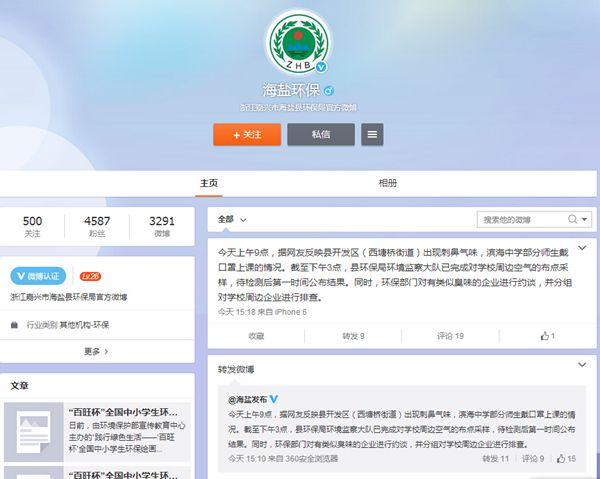 这则消息也被海盐县环保局的官微“@海盐环保”转发,并连续@了“@嘉兴环境保护”和“@浙江环保”。