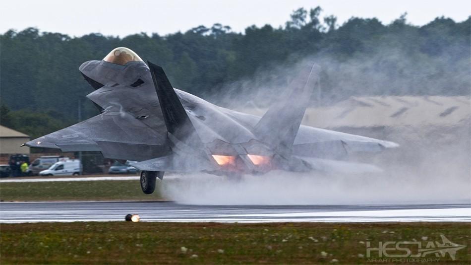 美国空军F-22A战斗机雨中起飞。