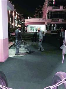 昨晚8时,华亭二幼一位家长拍摄的图片显示,施工人员正在对该校的塑胶跑道连夜铲除。