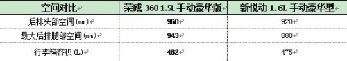 刚上市不久的荣威360,960mm的后排头部空间与943mm的最大后排腿部空间,均达到同级最大,就算是1米8的高个子乘坐,空间上也是绰绰有余。相比之下,新悦动后排头部空间920mm、后排腿部空间880mm,实际乘坐会比较拘束。