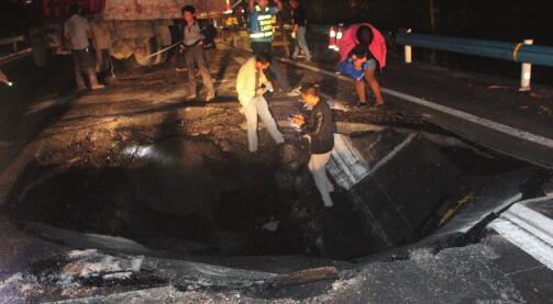 当天下午6点,铜仁高速交警二大队十中队民警接到一货车驾驶员报警称,其驾车在经过杭瑞高速德江县合兴镇境内时,路面突然沉陷出现一个大坑,车辆右后轮陷入其中,车身严重倾斜,随时都有侧翻的危险。接警后,民警立即驾车赶赴事发地点,远远看见满载货物的大型货车右后轮,完全陷入到高速路行车道上的一个坑里,车上的货物部分散落在应急车道内,仅快车道能供其他车辆缓慢通过。