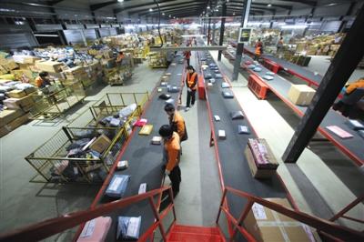 2013年11月12日晚23时许,申通快递北京分拨中心的工作人员正在对快件进行处理。资料图片 新京报记者 李冬 摄