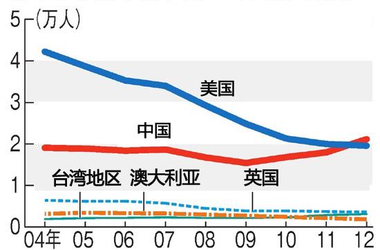 最新公布的2012年数据显示,日本留学生总人数时隔7年再次出现增加,达到约60138人,但赴美留学的人数仍然保持下滑,而赴中国留学的人数从2009年持续增加,到2012年突破两万人,成为日本学生最热门的留学对象国。