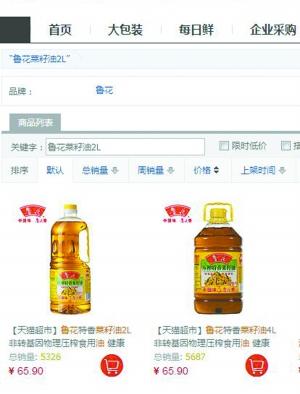 单价为65.9元的鲁花压榨菜籽油2L装商品以“满二件5折”方式促销,即消费者购买两瓶该产品可享受5折优惠。这意味着消费者买两件2L装鲁花菜籽油只需支付65.9元。但在同一平台的同一频道显示,一瓶4L装的鲁花菜籽油尽管没有任何优惠活动,标价同样也为65.9元。