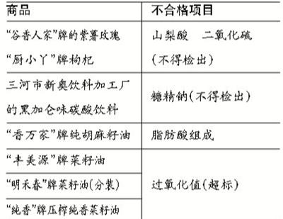 北京市食品药品监督管理局昨日通报,在监督检查工作中发现“厨小丫”牌枸杞、“香万家”牌纯胡麻籽油等7种食品不合格,现决定对不合格产品在流通领域采取停止销售措施。