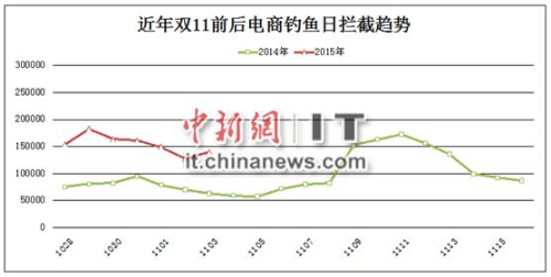 据腾讯安全数据显示,在2014年的双11的前三天,电商钓鱼网站的拦截呈现明显的上升趋势,并在节日当天达到了最高峰值。今年双11的电商钓鱼拦截虽然在10月底开始有下滑趋势,但整体趋势和去年一样,随着双11的到来而出现攀升,并将在双11当天达到峰值。腾讯反病毒实验室安全专家马劲松提醒用户双11网购节购物需要对钓鱼网站加以警惕。