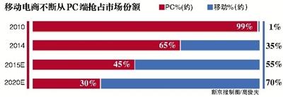 贝恩报告显示,移动电商不断从PC端抢占市场份额,由2010年占据中国线上零售市场交易额约1%,一路增长至2014年约35%。该机构预计,这一比例将在2015年达到55%,首次超越PC电商,并在2020年进一步达到70%。