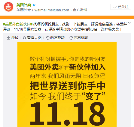 美团外卖的官方微博称“美团外卖将有新伙伴加入,开启新征程……”谁将成为美团外卖的新伙伴呢?是针锋相对的死敌饿了么,是背靠土豪亲爹的百度外卖,还是重新启程的口碑外卖?
