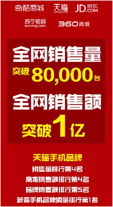 11月11日上午10点,即双11购物战开启10小时后,360奇酷官方发布消息,360奇酷手机开售仅10小时,销量突破8万台,总销售额突破1亿。这也是目前为止,全网所有手机品牌销量排行第四位,同时也是新晋品牌销量第一名。