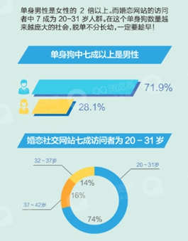 QQ浏览器大数据显示:全国单身人士中,男性占比是女性的2倍以上。且从婚恋社交网站访问情况来看,单身人群主要集中在20-31岁年龄段。所以,年轻男性依然是单身群体的中流砥柱,二男抢一女注定成为现实!