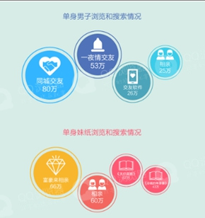 QQ浏览器数据显示,男女“脱光”方式和关注点大有不同。通过搜索内容发现,男性更加关注“同城交友”和“一夜情交友”;而女性分别是“富豪来相亲”、“相亲”。可以说男人的“脱光”方式更加直接且需求迫切,女性一方面看中经济基础,同时也需从“天价逼婚”、“总裁的单身妻”等不切实际的爱情幻想中回归现实,脚踏实地才能求得真幸福。