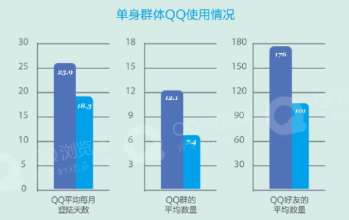 中国的光棍们在主动通过社交渠道寻求脱单。数据显示:单身用户登录QQ高达25.9天/月,而且他们喜欢加入各种热闹的QQ群,平均入群数达12.1个,超过普通用户近1倍。也正因此,他们的QQ好友数量比普通用户也多出75个。